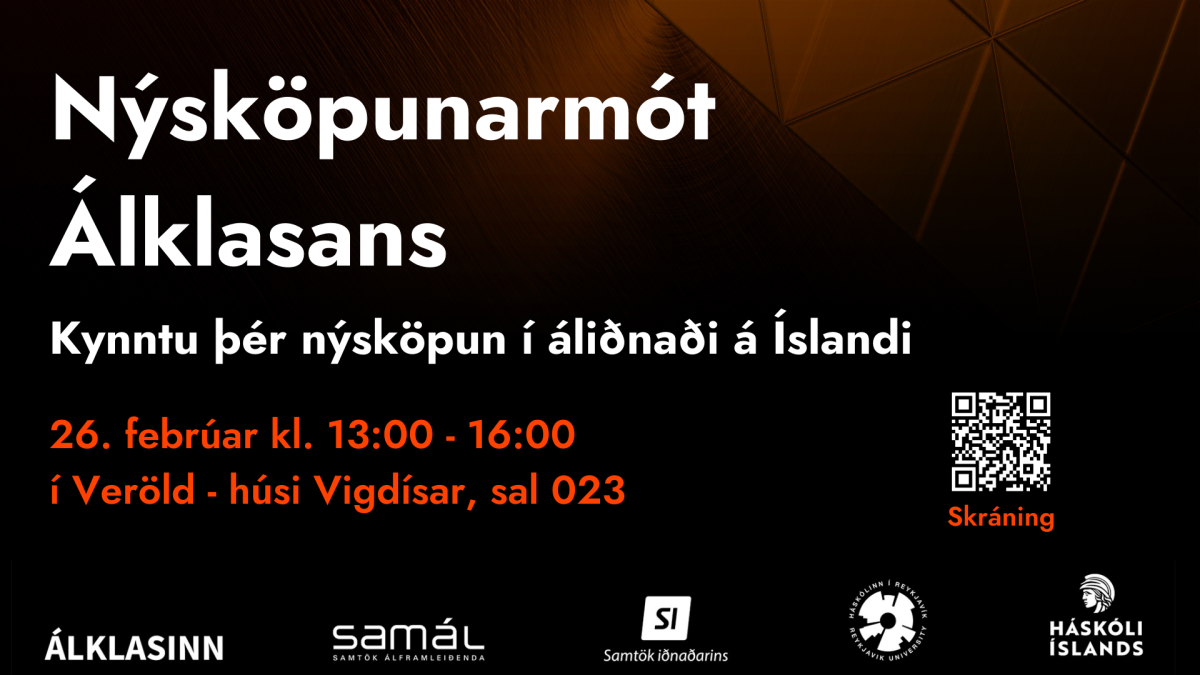 Nýsköpunarmót Álklasans verður haldið í Veröld - húsi Vigdísar, sal 023, fimmtudaginn 26. febrúar frá kl. 13:00 - 16:00.